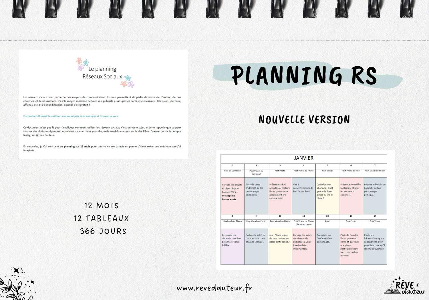 Le document comprend des conseils pour gérer tes réseaux sociaux et un planning de janvier à décembre.